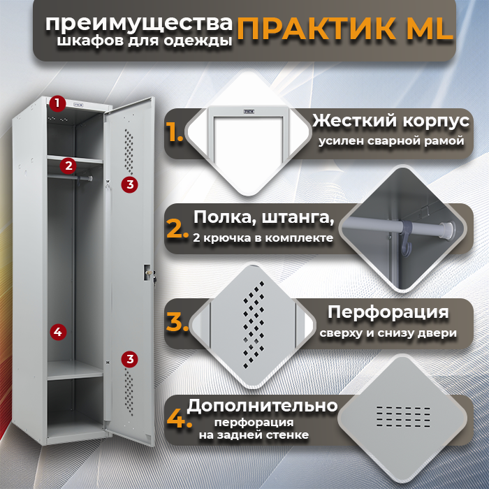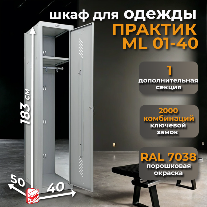 Шкаф ML 01-40 — это высококачественная и практичная модель для хранения одежды, идеально подходящая для использования в офисах, складах, производственных и общественных помещениях. Конструкция шкафа выполнена из прочного металла с усилением сварной рамой, что обеспечивает отличную устойчивость и долгий срок службы.