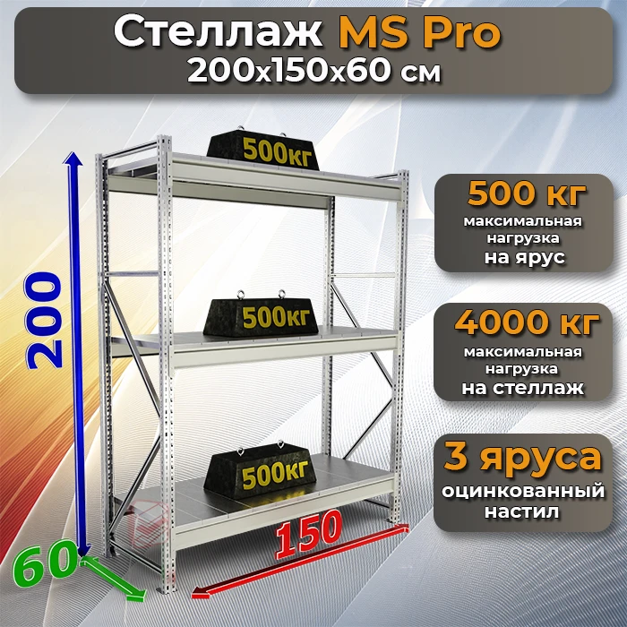 Стеллаж складской MS Pro 200х150х60 с 3 полками — оптимальное решение для хранения грузов на складах, производствах, в гаражах, торговых точках и кладовых.